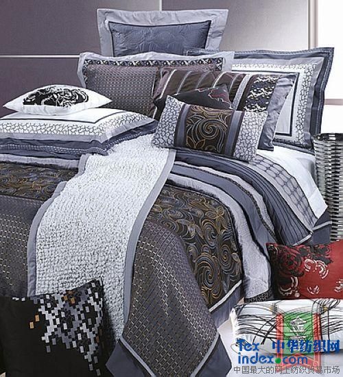 此款設計采用、體現了傳統與浪漫、古典與現代相融合的手法與風(fēng)格,緊扣主題。圖案母題選擇了變形的傳統卷草紋樣與中國園林木窗花格,作為主設計元素。而靠墊上的長(cháng)方格及漸變圓點(diǎn)等計算機圖形,則突出了現代和時(shí)尚的特點(diǎn),色彩以灰色為主調,妃色、金黃色等作局部對比,產(chǎn)生了即統一、協(xié)調又活潑、豐富的藝術(shù)效果。面料采用高檔的提花色織紡織品,一些細則應用先進(jìn)的彈力繡花工藝,更提高了產(chǎn)品的檔次與品位。套件的枕頭、靠墊上有些花形與主圖案的相關(guān)性與系列配套感稍顯不足。