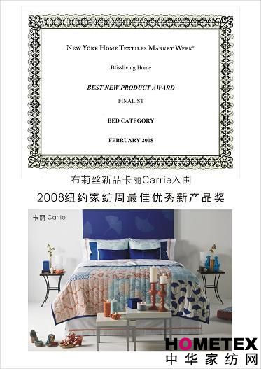 布莉絲新品卡麗Carrie入圍2008紐約家紡周最佳優(yōu)秀新產(chǎn)品獎獲獎證書(shū)