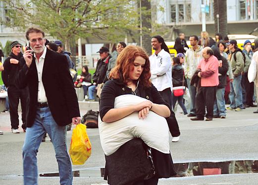 枕頭大戰在情人節當晚的6-8點(diǎn)舉行,還沒(méi)到時(shí)間,街上抱著(zhù)枕頭走的人越來(lái)越多,枕頭大軍都聚集到Ferry building前面的廣場(chǎng)上。